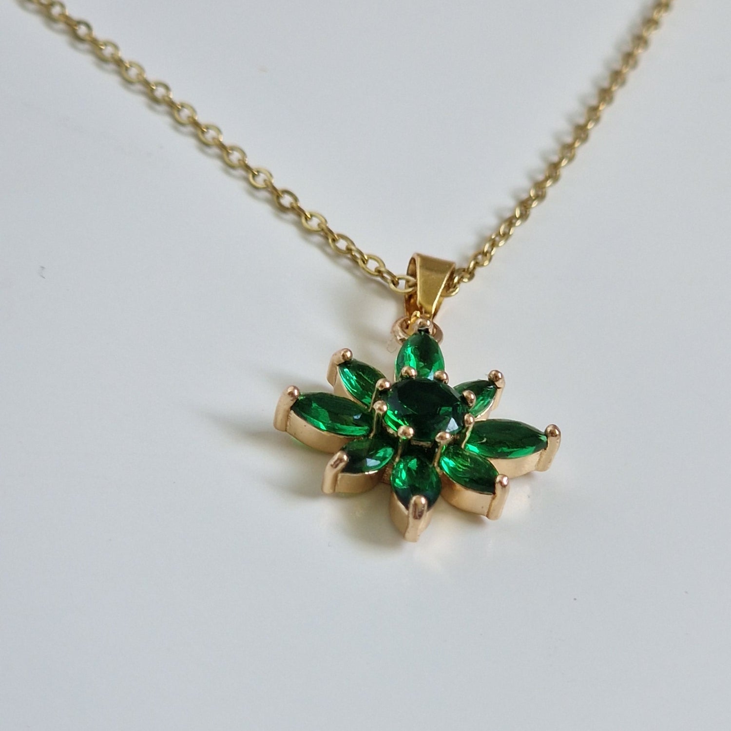 Symbole de raffinement et de chance, le collier Fleur Chanceuse séduit par son pendentif en forme de fleur vert émeraude aux huit pétales délicatement dessinés. Chaque détail reflète féminité, vitalité et élégance intemporelle.